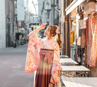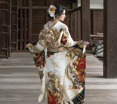 Furisode is a formal attire for unmarried women and is worn at coming-of-age ceremonies and weddings. The difference from a kimono is the length of the sleeves.