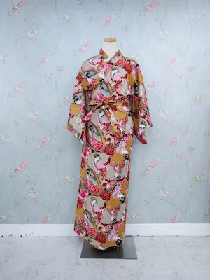 We have a wide selection of kimonos for both women and men. The fabrics available include polyester and silk.