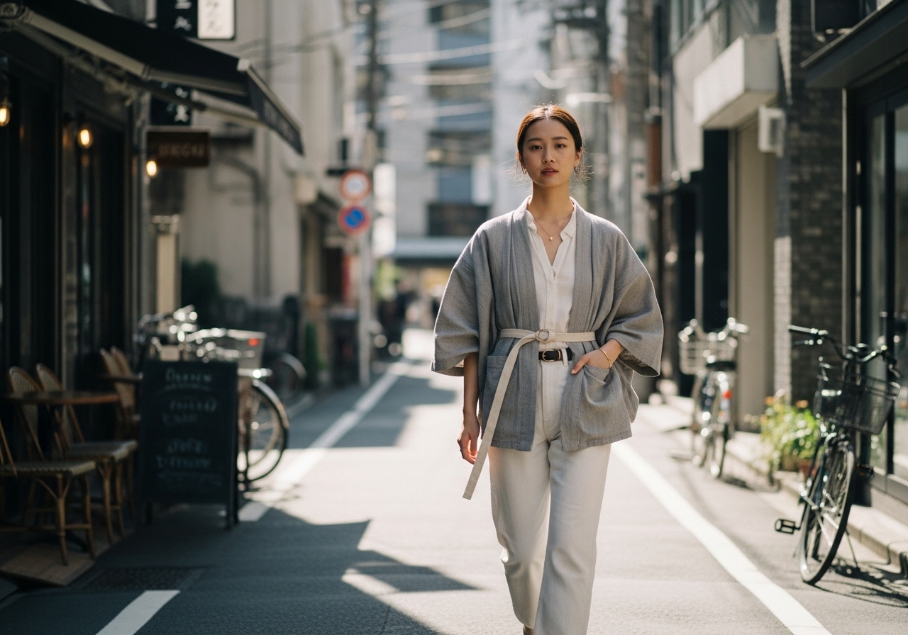 Brands like UNIQLO’s “Airism Kimono Cardigan” and Muji’s organic cotton haori have made this look both effortless and accessible.