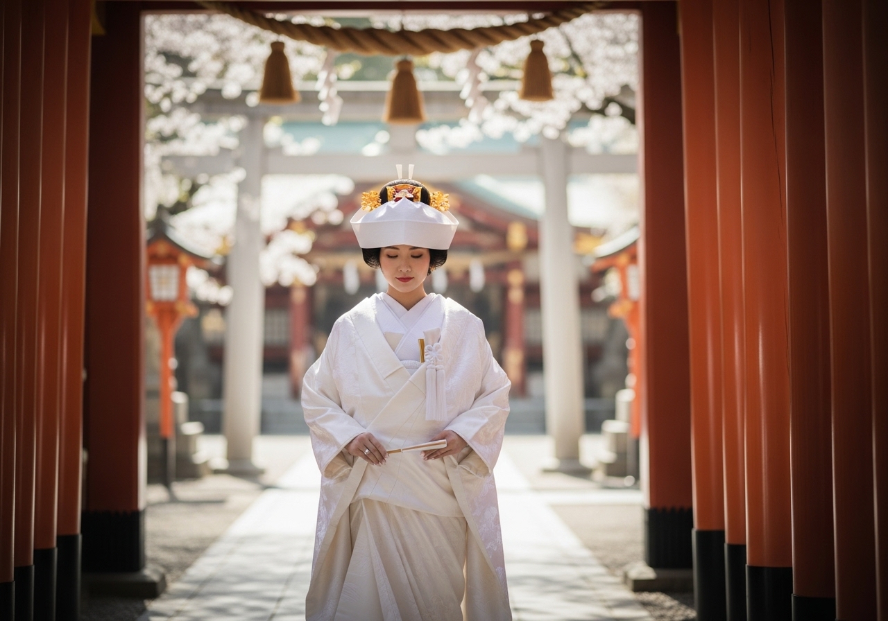 Many couples today mix traditional and modern styles — a Shiromuku ceremony at a shrine, followed by a Western gown for the reception.
